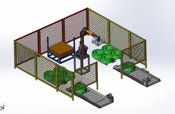 پس از اینکه محصول نهایی به موقعیت قرار دادن کمربند حمل و نقل می رسد، بازوی رباتیک محصول نهایی را روی پالت می گیرد تا یک لایه پر شود.بازوی رباتیک سپس پالت محصول نهایی کارتونی را از پالت کارتونی برمی گیرد و عمل را تکرار می کند تا زمانی که پالت محصول نهایی مرتب شود.